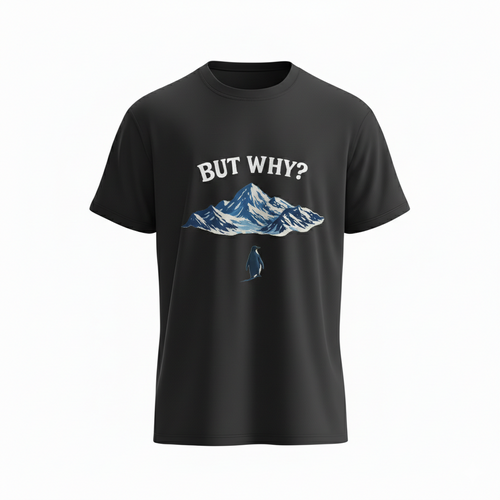 "But Why?" Penguin & Mountain – Existential Humor T-Shirt